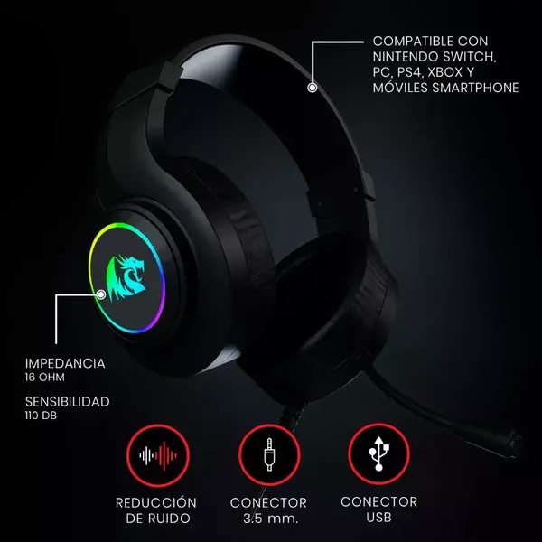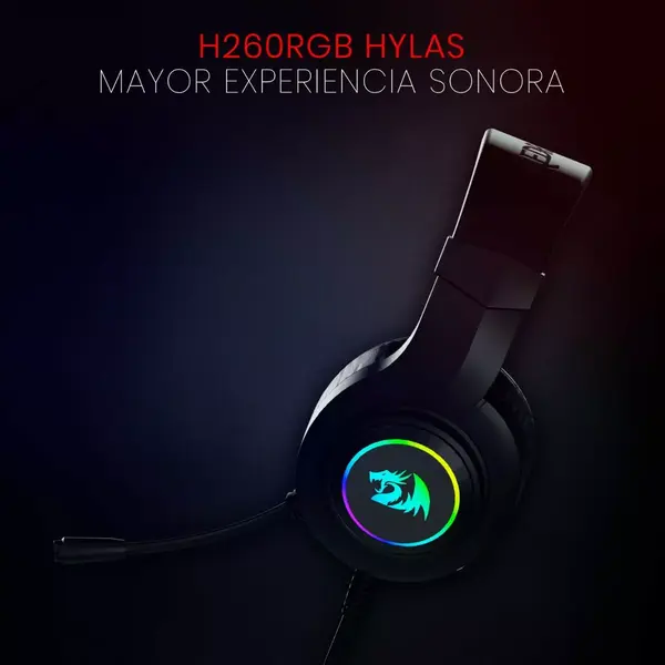 AUDÍFONOS GAMER REDRAGON HYLAS BLACK / H260RBG / DIADEMA / OVER-EAR / 3.5 MM / MICRÓFONO FLEXIBLE OMNIDIRECCIONAL / RGB