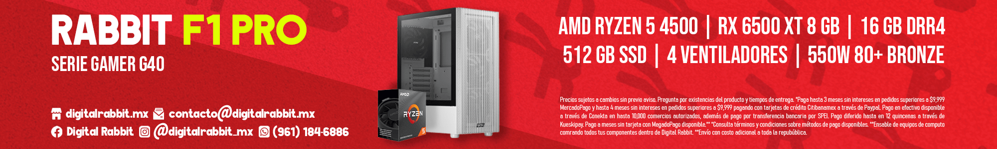 El procesador AMD Ryzen 5 4500 de seis núcleos y doce hilos proporciona un rendimiento superior, permitiendo que los usuarios disfruten de juegos intensivos en recursos y aplicaciones multitarea sin interrupciones. Este procesador de última generación es perfecto tanto para tareas de gaming como para proyectos de edición de video, streaming y otras actividades que requieran gran capacidad de procesamiento. Con la potencia de este procesador, la RABBIT F1 PRO ofrece una experiencia de juego fluida, incluso en configuraciones gráficas complejas.