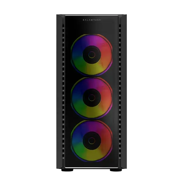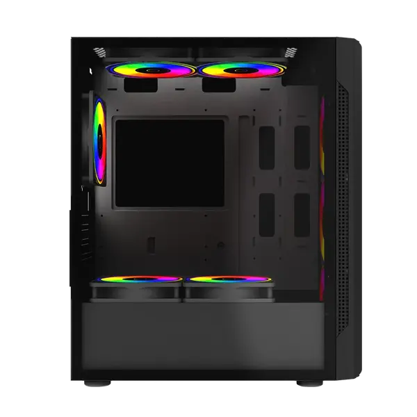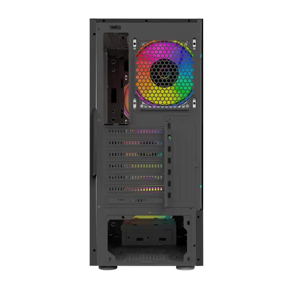 Este gabinete se destaca por su excelente gestión de aire, integrando 4 ventiladores RGB preinstalados que garantizan un flujo de aire óptimo y un espectacular efecto luminoso personalizable. La conectividad frontal incluye una ranura USB 3.0 para transferencias rápidas de datos, manteniendo accesibilidad y comodidad. Su construcción prioriza la facilidad de instalación y el cable management, ideal para montajes limpios y organizados.