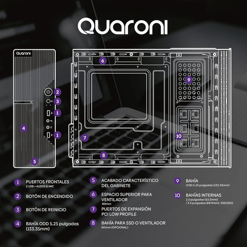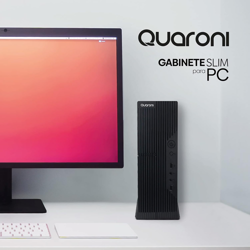 El acabado lineal en color negro no solo aporta un look moderno y minimalista, sino que también es resistente a las huellas dactilares, manteniendo su apariencia impecable. Su factor de forma delgado lo hace perfecto para espacios donde el tamaño es una limitante, sin comprometer la potencia gracias a la fuente incluida. El Gabinete Slim Quaroni es la elección perfecta para quien valora el espacio, el diseño y la practicidad en un solo producto.